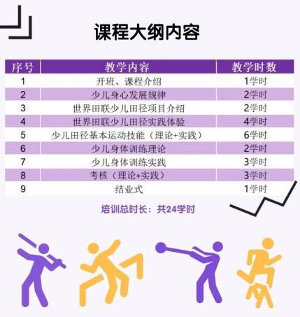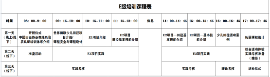 第1天为线上理论课,第2天和第3天线下实践和考核培训,共24学时。培训按照《中国田径协会教练员资质认证体系建设方案》规定的教学内容进行。主要包括:少儿身心发展规律、世界田联少儿田径项目介绍和实践体验、少儿田径基本运动技能、少儿身体训练理论和实践等。具体培训将根据举办地疫情防控要求灵活调整,以临近通知为准。